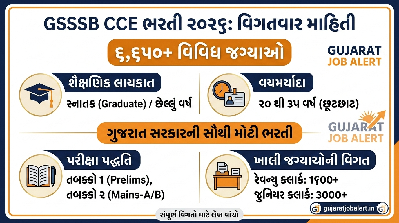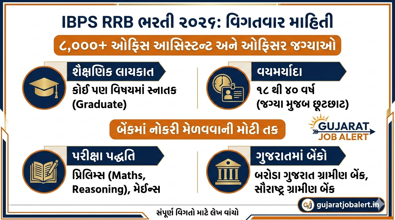 IBPS ગ્રામીણ બેંક ભરતી ૨૦૨૬ કુલ જગ્યાઓ: ૮,૦૦૦+ (Office Assistant & Officers) બેંકિંગ ભરતીની અપડેટ WhatsApp પર મેળવો Gujarat Job Alert: ઇન્સ્ટિટ્યૂટ ઓફ બેંકિંગ પર્સનલ સિલેક્શન (IBPS) દ્વારા દેશની વિવિધ પ્રાદેશિક ગ્રામીણ બેંકો (RRB) માં ઓફિસ આસિસ્ટન્ટ (ક્લાર્ક) અને ઓફિસર સ્કેલ-૧, ૨ અને ૩ ની જગ્યાઓ માટે મોટી ભરતીની જાહેરાત કરવામાં આવી છે. ભરતીની મુખ્ય … Read more